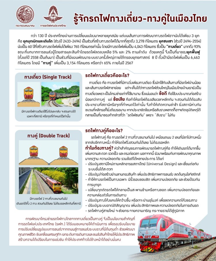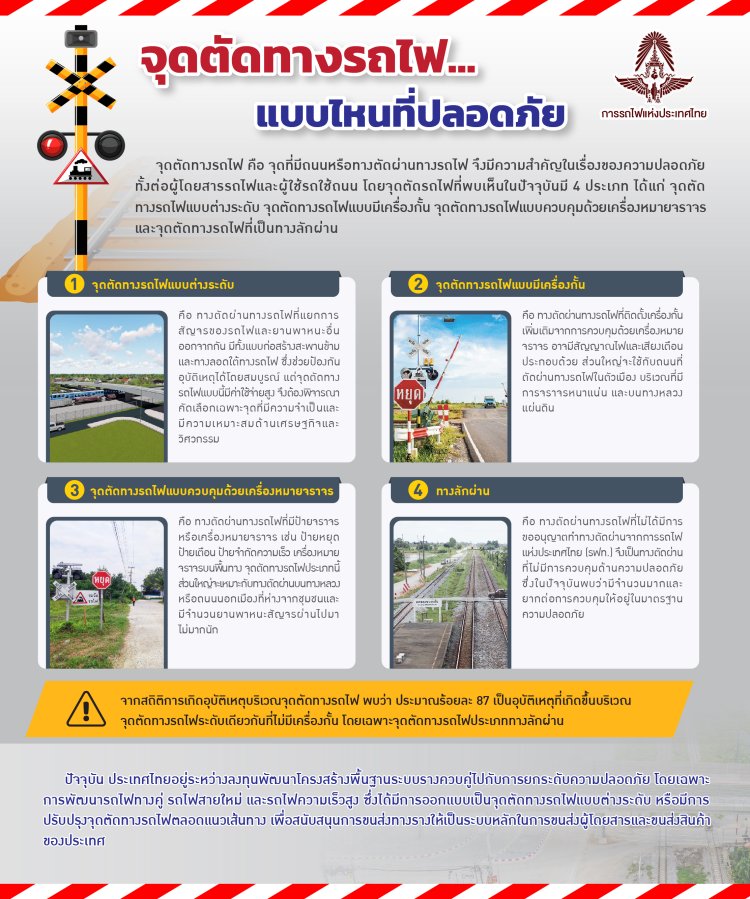 อีกความมุ่งมั่นพยายามของการรถไฟแห่งประเทศไทย (รฟท.) ในการพัฒนาโครงสร้างพื้นฐานทางราง ควบคู่ไปกับการยกระดับมาตรฐานความปลอดภัย โดยเฉพาะการปรับปรุงและพัฒนาจุดตัดทางรถไฟให้เหมาะกับสภาพพื้นที่และมีความปลอดภัยทั้งต่อผู้โดยสารรถไฟและผู้ใช้รถใช้ถนน เพื่อสนับสนุนให้การขนส่งทางรางให้เป็นระบบหลักในการขนส่งผู้โดยสารและขนส่งสินค้าของประเทศสร้างโอกาส ยกระดับคุณภาพชีวิตได้อย่างแท้จริง (พฤศจิกายน 2566)
