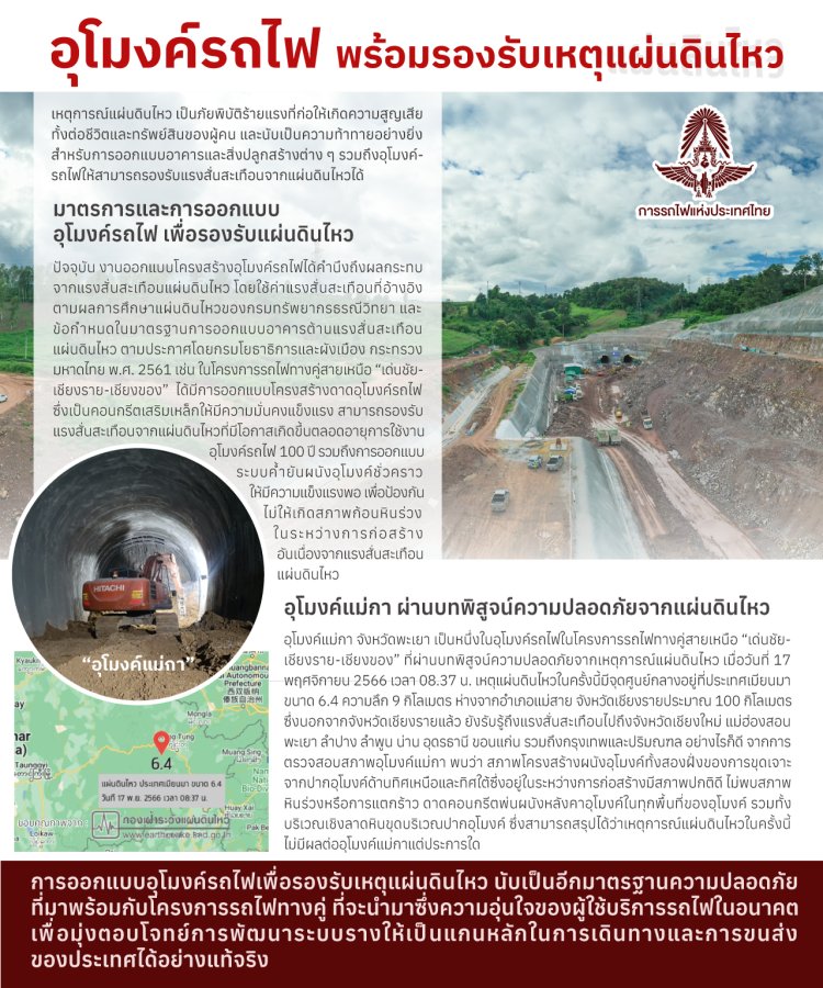 อุโมงค์รถไฟของโครงการรถไฟทางคู่เด่นชัย-เชียงราย-เชียงของ ถูกออกแบบมาให้รองรับเหตุแผ่นดินไหว นับเป็นมาตรฐานความปลอดภัยที่การรถไฟฯ ให้ความสำคัญ เพื่อสร้างความอุ่นใจให้กับผู้ใช้บริการในอนาคต (ธันวาคม 2566)