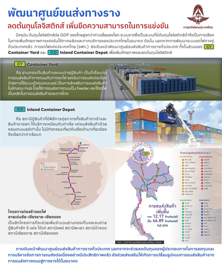 ศููนย์ขนส่งสินค้าทางรางอย่าง Container Yard และ Inland Container Depot มีความสำคัญอย่างไร และโครงการก่อสร้างรถไฟ สายเด่นชัย-เชียงราย-เชียงของ ช่วยเพิ่มศูนย์ขนส่งสินค้าทางรางมากน้อยแค่ไหน ดูรายละเอียดเพิ่มเติมได้จากบทความนี้ (พฤษภาคม 2567)