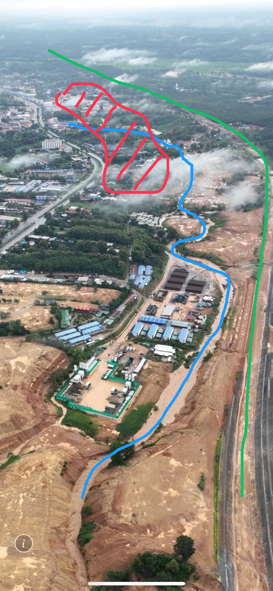 นอกจากนี้บริเวณพื้นที่น้ำท่วมระบายน้ำไม่ทัน ทำให้เกิดน้ำท่วมเฉียบพลัน ซึ่งหากมองจากภาพถ่ายมุมสูง ตามภาพแนวเส้นสีเขียวเป็นแนวทางรถไฟที่อยู่ระหว่างก่อสร้างเป็นทางตัดไม่ใช่เป็นการถมดินคันทาง และไม่ได้เป็นเส้นทางระบายน้ำหรือขวางทางน้ำแต่อย่างใด แนวเส้นสีฟ้าเป็นคลองแม่กา พื้นที่สีแดงเป็นบริเวณหอพักที่คลองแม่กาไหลผ่าน เมื่อมีปริมาณน้ำหลากไหลล้นคลองประกอบมีสิ่งปลูกสร้างกีดขวางทางน้ำ ทำให้น้ำไหลไม่สะดวกจึงเกิดน้ำท่วมเฉียบพลัน
