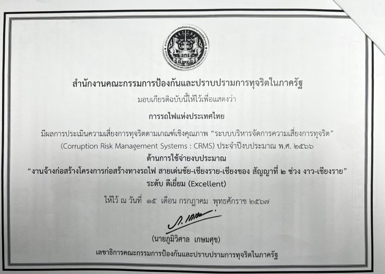 โดยก่อนหน้านี้ สำนักงานคณะกรรมการป้องกันและปราบปรามการทุจริตในภาครัฐ ได้ประเมินความเสี่ยงการทุจริตตามเกณฑ์เชิงคุณภาพ ประจำปีงบประมาณ 2566 ด้านการใช้จ่ายงบประมาณ “งานจ้างก่อสร้างโครงการก่อสร้างรถไฟสายเด่นชัย-เชียงราย-เชียงของ สัญญาที่ 2 ช่วงงาว-เชียงราย” อยู่ในระดับดีเยี่ยม (Excellent) อีกด้วย