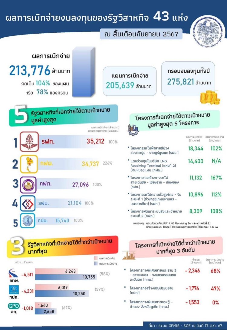 สำนักงานคณะกรรมการนโยบายรัฐวิสาหกิจ (สคร.) ได้สรุปผลการเบิกจ่ายงบลงทุนของรัฐวิสาหกิจที่อยู่ในกำกับ จำนวน 43 แห่ง ณ สิ้นเดือนกันยายน 2567 ผลปรากฎว่า การรถไฟแห่งประเทศไทย สามารถเบิกจ่ายได้ไม่ต่ำกว่าร้อยละ 95 ของแผนการเบิกจ่ายและมีมูลค่าสูงสุด 35,212 ล้านบาท ซึ่งแสดงถึงการบริหารจัดการโครงการอย่างรัดกุมสอดคล้องกับแผนการดำเนินงาน...อ่านข่าวเพิ่มเติมได้ที่ https://www.sepo.go.th/news/1629